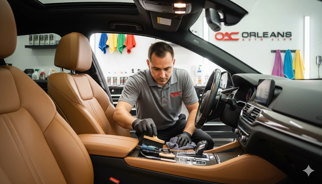 Orleans temperature extremes stress interior materials. Summer heat and UV exposure crack leather and fade fabrics. Winter cold makes materials brittle. Regular conditioning during detailing appointments keeps leather supple and prevents cracking.